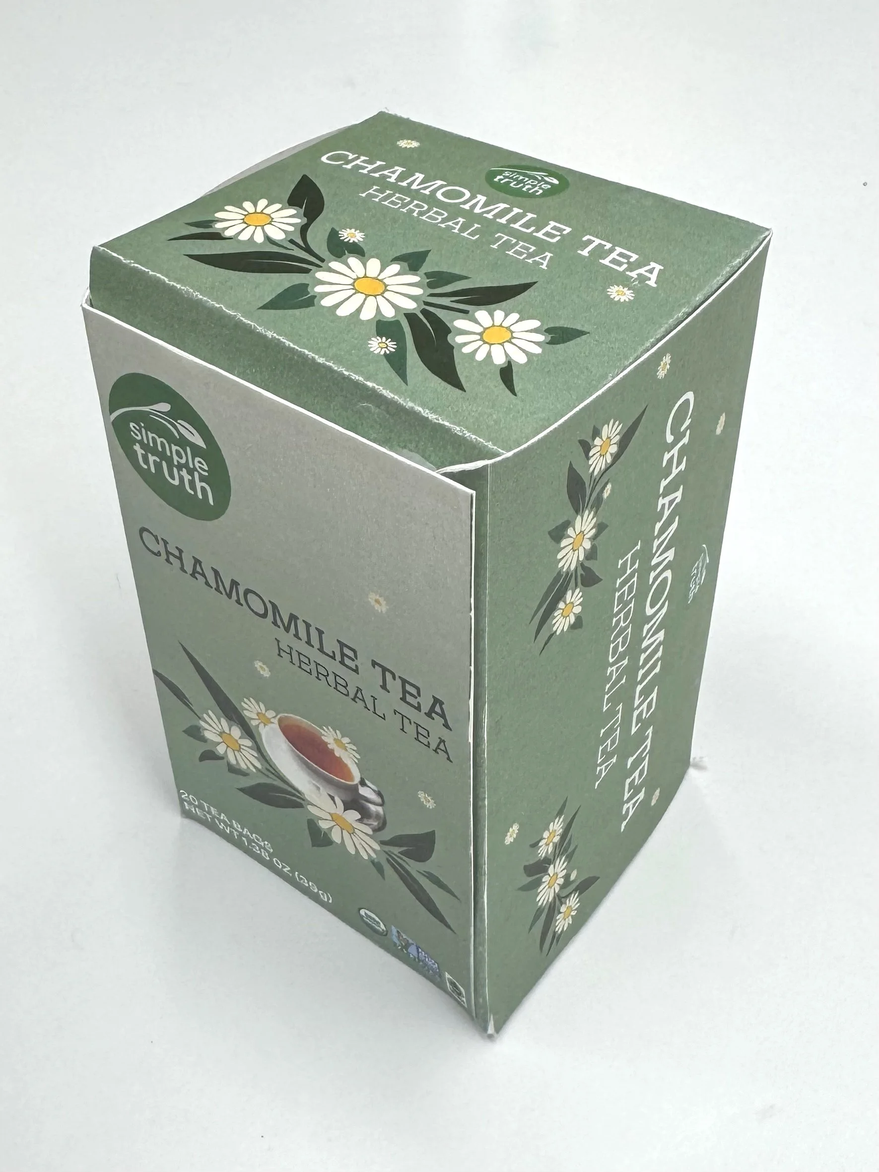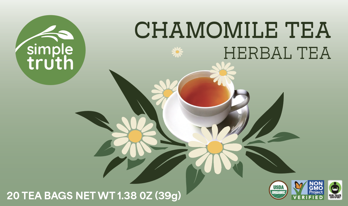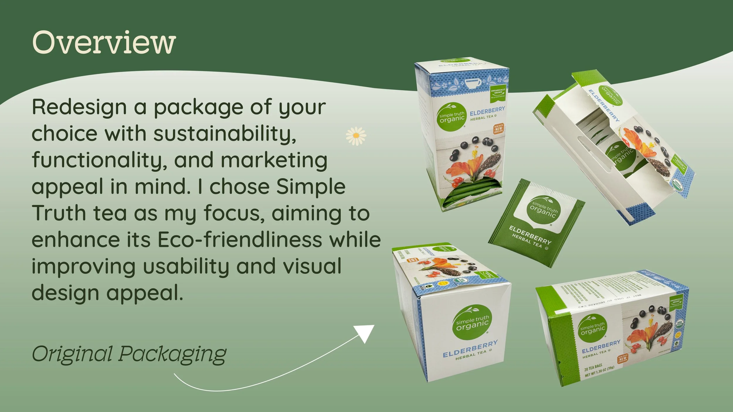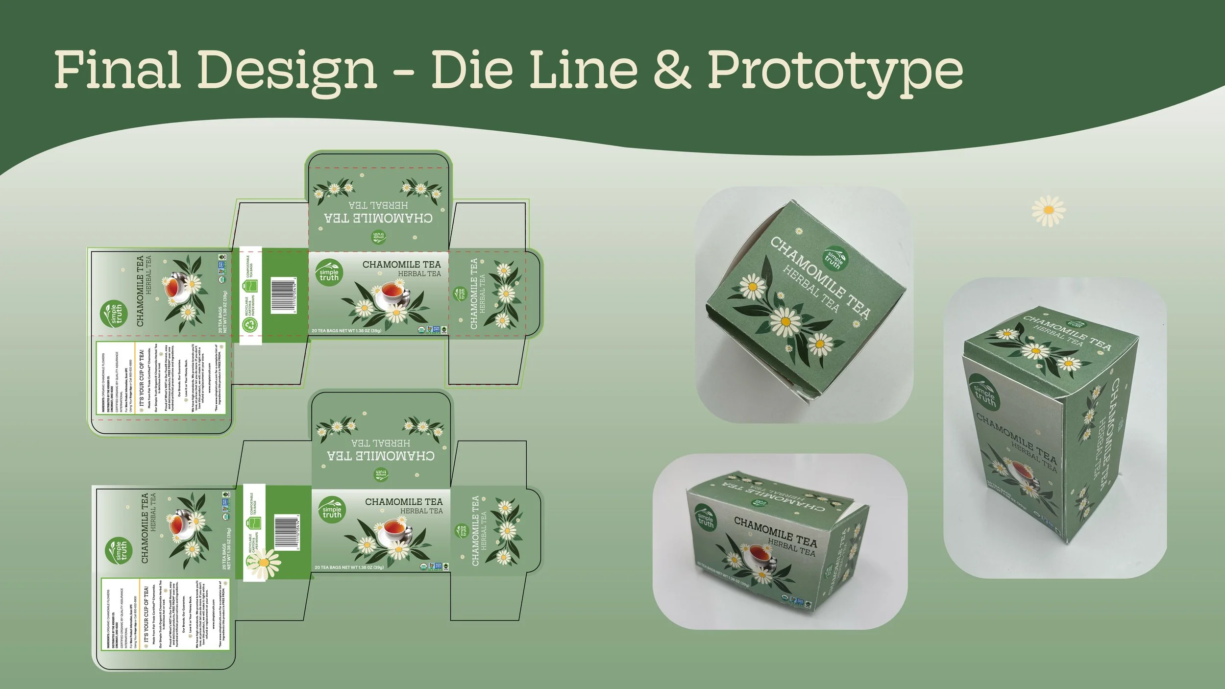 I redesigned the Simple Truth chamomile tea packaging to improve sustainability, functionality, and shelf appeal while modernizing the brand’s visual identity.